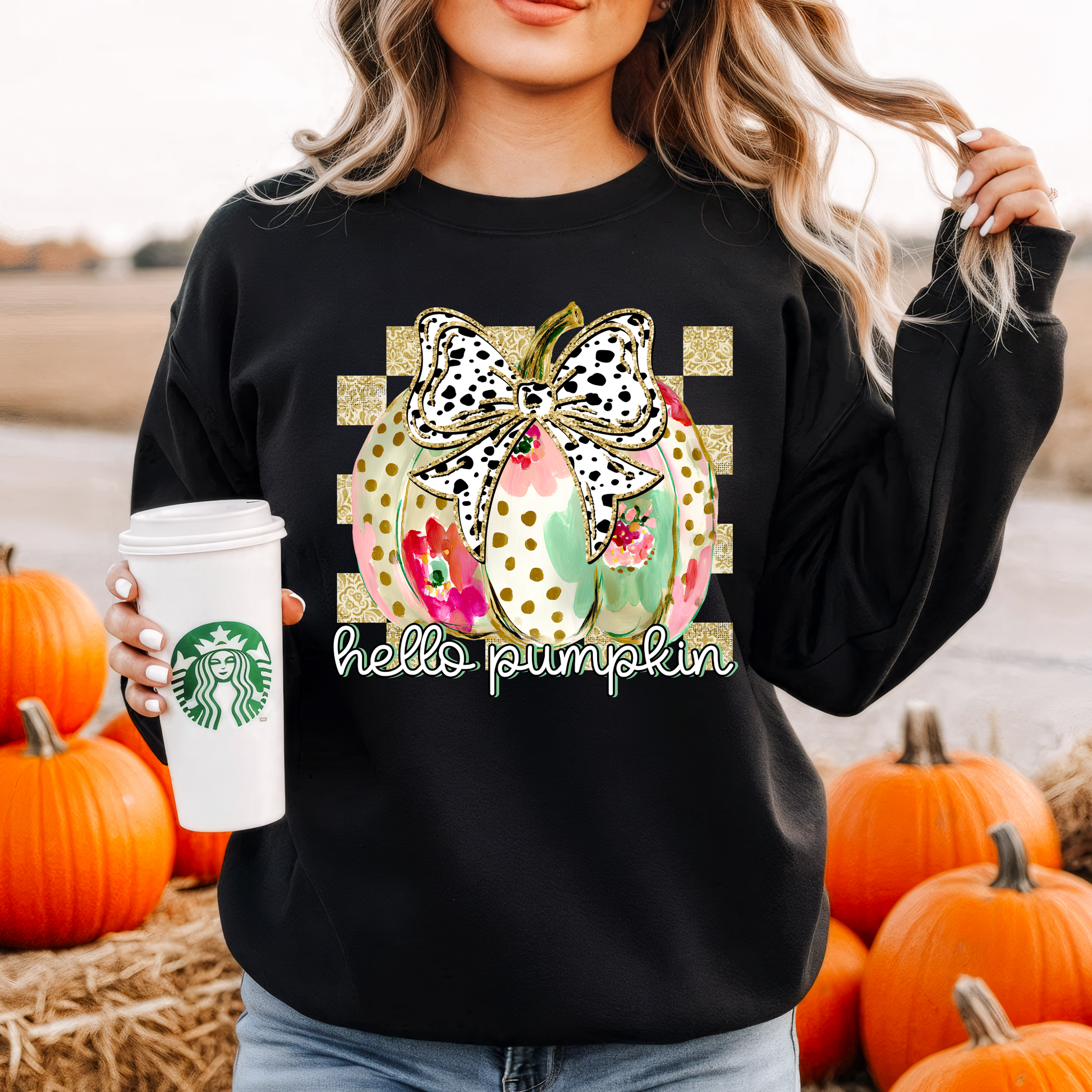 RTS*POLKA DOT BOW HELLO PUMPKIN * GLITTER CLEAR FILM SCREEN PRINT TRANSFER