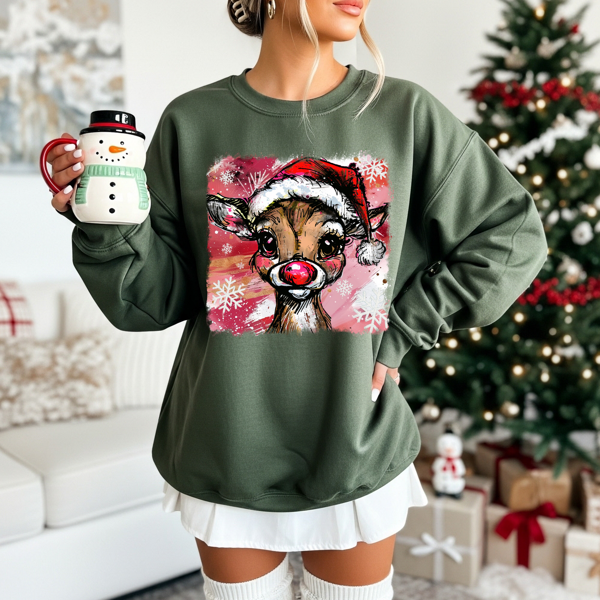 RTS* RUDLPH WITH SANTA HAT* GLITTER CLEAR FILM SCREEN PRINT TRANSFER